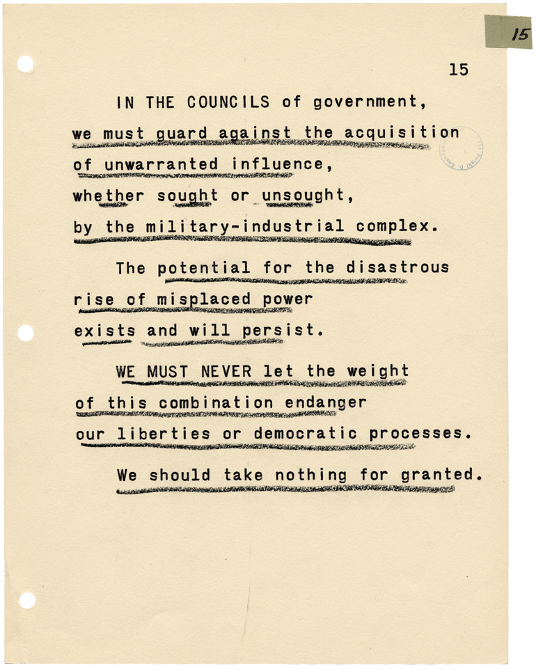 In the councils of government, we must guard against the acquisition of unwarranted influence, whether sought or unsought, by the military-industrial complex. The potential for the disastrous rise of misplaced power exists and will persist. We must never let the weight of this combination endanger our liberties or democratic processes. We should take nothing for granted. Only an alert and knowledgeable citizenry can compel the proper meshing of the huge industrial and military machinery of defense with our peaceful methods and goals, so that security and liberty may prosper together.