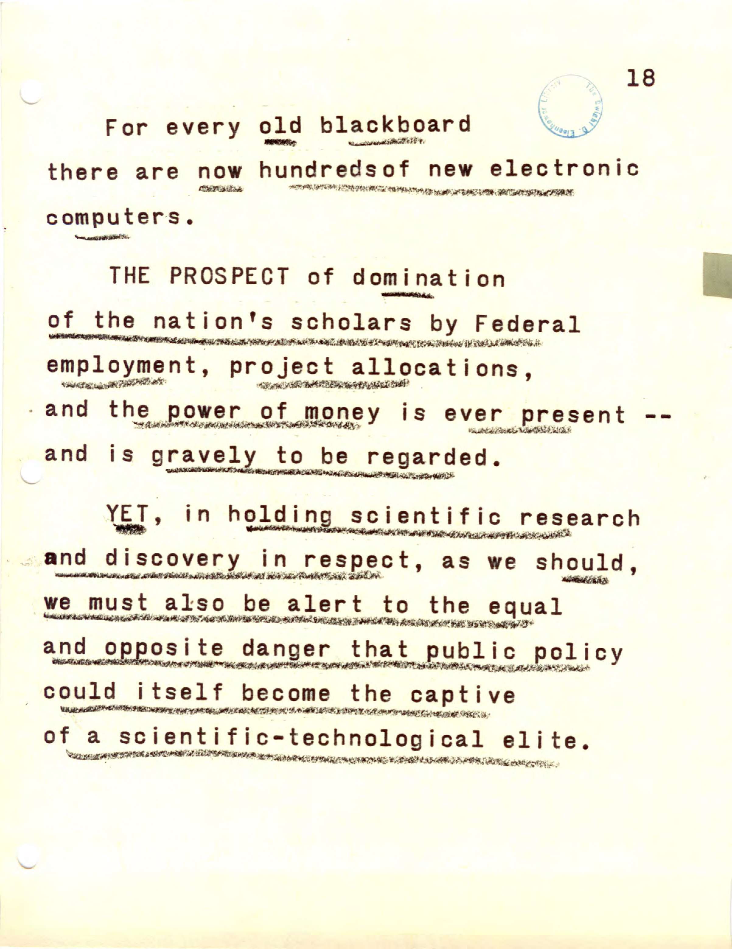 The prospect of domination of the nation's scholars by Federal employment, project allocation, and the power of money is ever present and is gravely to be regarded.
